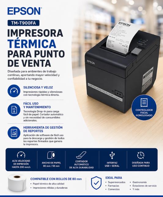 La impresora fiscal Epson TM-T900FA está diseñada para trabajo continuo en entornos comerciales exigentes, brindando velocidad, confiabilidad y eficiencia en cada operación.